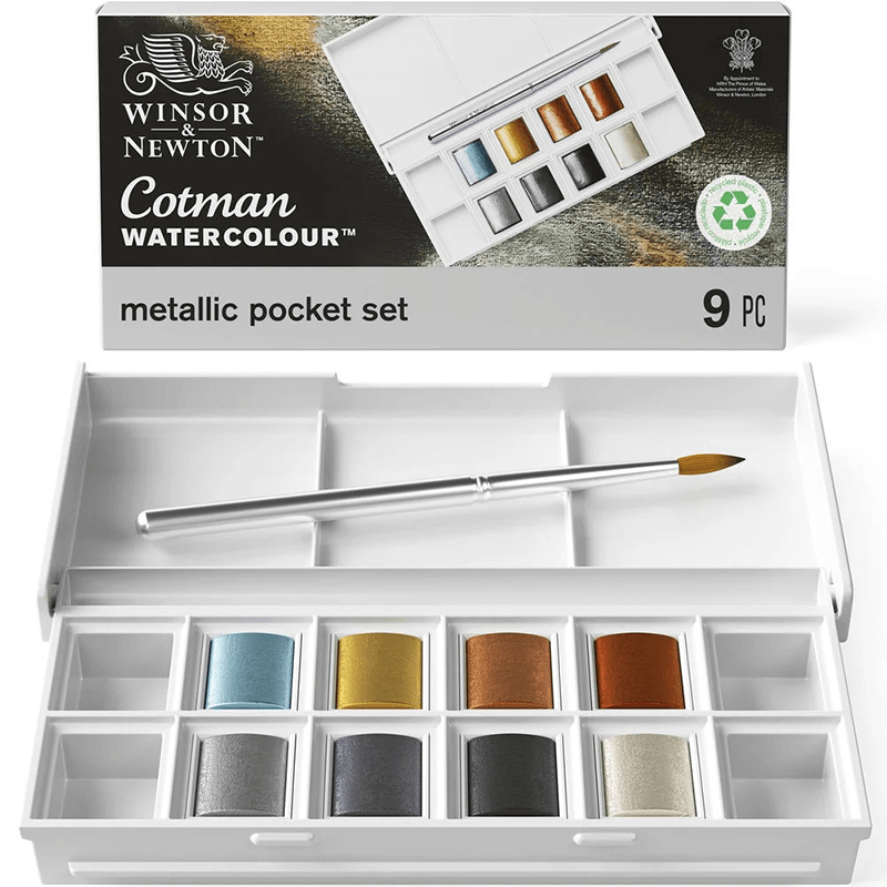 Oplev 8 Cotman metalliske akvareller lavet med kvalitets, fine art pigmenter i et sæt i lommestørrelse. Inkluderer en rejsepensel samt plads til yderligere 4 farver.