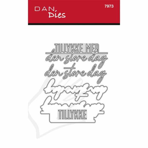 Tillykke med den store dag indeholder 5 dies, 3 tekster og 2 skygger Skyggerne passer til den blandede tekst og den matchende "den store dag". Den blandede tekst og "den store dag" i sammenhængende skrift passer oven på hinanden, så du kan lime dem sammen og få den blandede tekst i 2 forskellige farver. "TILLYKKE" teksten passer sammen med 7965 t-shirt alfabet og 7964 t-shirt tal.