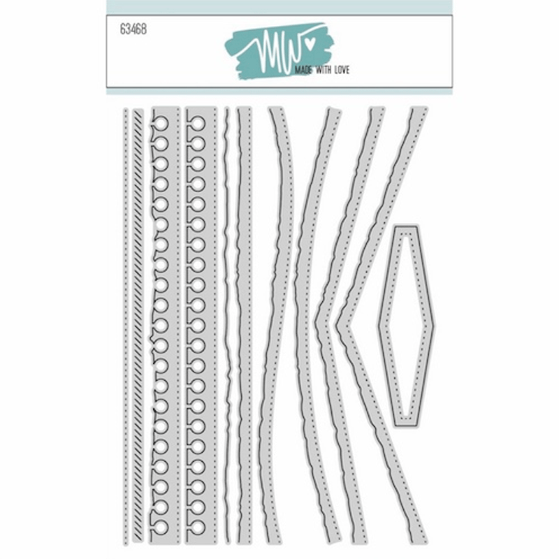 Edges fra Made With Love indeholder 11 dies - 2 effekt dies med syninger, 2 notebogs kanter, 6 afrevne kant dies med lige, buet og vinklet kanter og syninger og 1 label die (passer som lag til label i Sketches 3 (63403)).