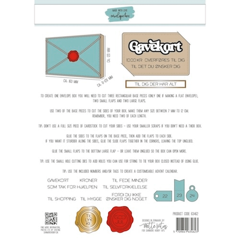 Envelope Box fra Made With Love kan bruges til at lave en fin stor æske hvor du selv kan tilpasse dybden på æsken til netop det du skal give. Brug den f.eks. til at lave kortsæt med A6 kort inkl C6 kuverter som værtindegaver. Eller måske som en julekalender eller opbevaring til julepynt?
