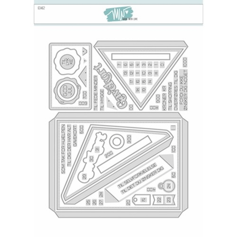Mette har fyldt det store sæt ud med en masse lækre ting - Primært med fokus på at kunne lave små tags med numre på til julekalendre eller på at lave gavekort. Blandt andet inkluderer sættet slidser til at sætte gavekort fast, gavekorts base (8,8x5,7cm) en stort Gavekort tekst med skygge og en masse små tekster du kan kombinere på kryds og tværs.
