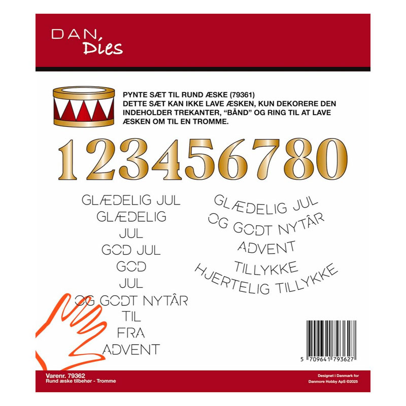 Rund æske tilbehør - tromme fra Dan Dies indeholder 3 dies der bruges til at lave den store runde æske (79361) til en tromme. Sætte indeholder derudover en masse tekster der kan bruges til at skære ned i papiret på f.eks. pynte båndene - eller brug dem på kort og andre projekter. Teksterne er ca. 5,5mm i højden. Sættet indeholder også tallene 0-8 - Brug 6 tallet til at lave 9. Tallene er ca. 2,4cm i højden. Æskens indvendige mål er ca. 145mm i diameter og 75mm i højden. Kan bruges til at opbevare et hav af ting, f.eks. 4 mellem trommer og 4 original trommer, 2 mellem trommer og 16 mini trommer, eller 14 original trommer. (Alle antal afhænger af materialer og pynt)