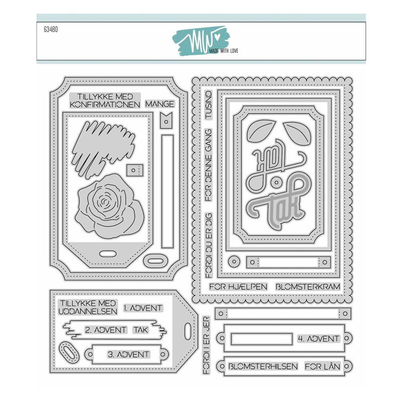 Sketches 14 sættet fra Made With Love bygger videre på sketches serien - denne gang med fokus på til og fra kort og tak tekster. Sættet indeholder selvfølgelig også basis ting som rektangler, blomst og malet hjerte og flotte rammer der passer til Labels 3 (63476). Teksterne inkluderer et "tak" i script stil med skygge med tilhørende små tekster som "Tusind", "for lån" og "Fordi du er dig". Derudover er der også "Blomsterhilsen", "Blomsterkram", "Tillykke med konfirmationen", "TIllykke med uddannelsen" og "1. advent". Den store blonde rektangel måler ca. 105x148 mm. Rosen måler ca. 45x42mm. Stor label ramme ca. 90x133mm.