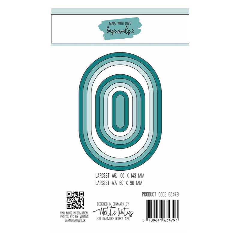 Basic Ovals 2 fra Made With Love indeholder 10 ovale dies. 4 i A6 format og 6 i A7 format. Den største A6 måler 10x14,3 cm og den største A7 er 6x9 cm. Kombiner med Basic Ovals 1 (63478) for at kunne lave helt tynde rammer eller lag.