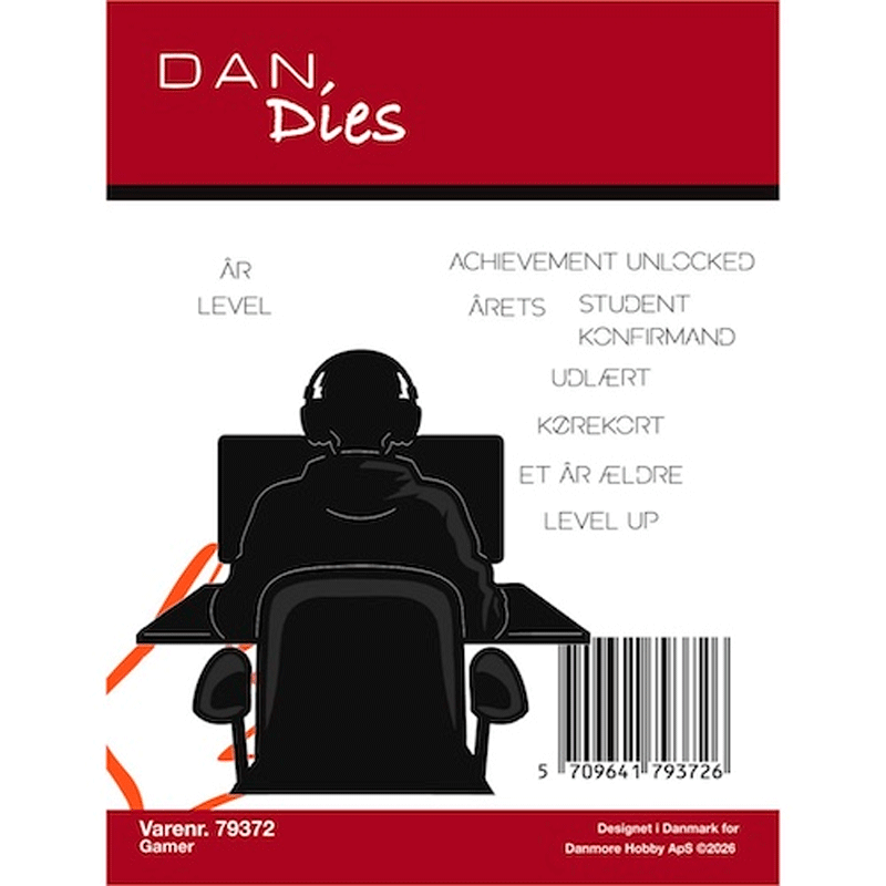 Gamer fra Dan Dies indeholder en silhouet af en gamer ved computeren, samt en bred vifte af tekster. Teksterne er bygget op omkring "Achievement unlocked", som betyder at man har opnået noget sejt i sit spil. Dertil kan man f.eks. bruge "Årets student", "Et år ældre", "Level up"(man bliver større/sejere i spillet, lidt ligesom fødselsdag) Skær silhouetten ud i flere farver og klip de små samlinger over for f.eks. at give en farvet trøje på eller brug 3D puder imellem delene for at give det mere dybde.