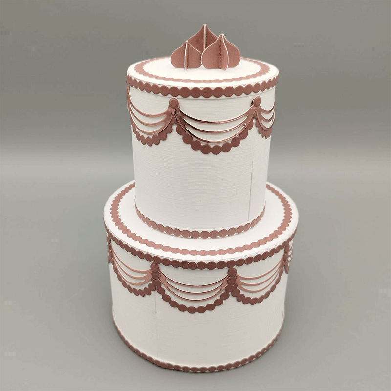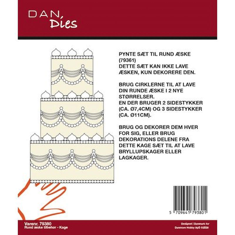 OBS! Kræver 79361 rund æske for at kunne lave æskerne. Rund æske tilbehør - kage indeholder 2 cirkler til at lave æsken i mindre størrelser, samt en meget lav låg kant. Sættet indeholder derudover pynte dele til at kunne dekorere æskerne som en kage - enten som enkelt æske, eller sæt dem ovenpå hinanden og lav en bryllupskage. Sættet har også små tekster, samt en lidt større tillykke. Alle disse skærer teksten ned i papiret. Æsken kan med dette laves med ca. Ø11 og Ø7,5 cm. Æskerne laves som den originale runde æske, men bruger blot færre side stykker.
