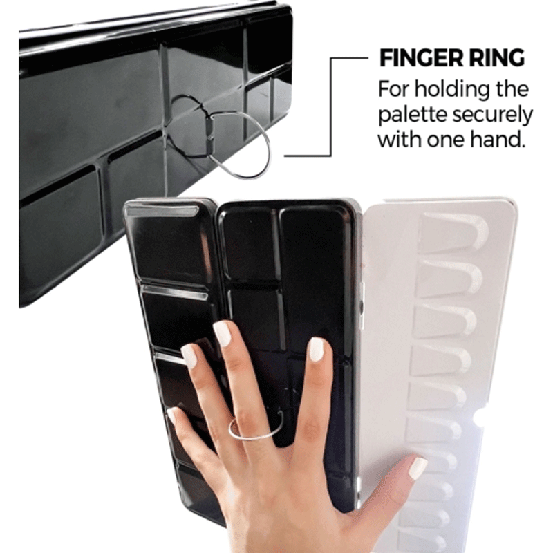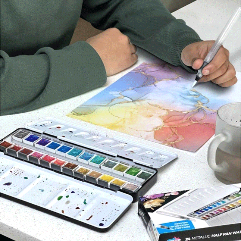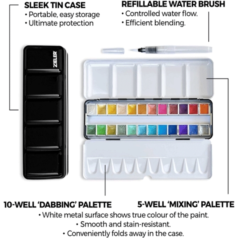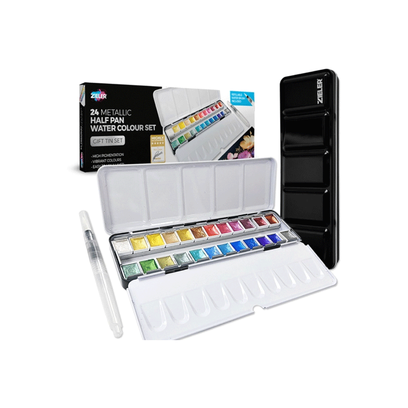 Zieler 24 Metallic Half Pan Watercolour Set er et eksklusivt akvarelsæt med 24 metalliske half pans, 5-brønds blandepalet, foldbar dabbing palet samt genopfyldelig vandpensel. Leveres i elegant metaldåse og giver intense, skinnende farver med høj