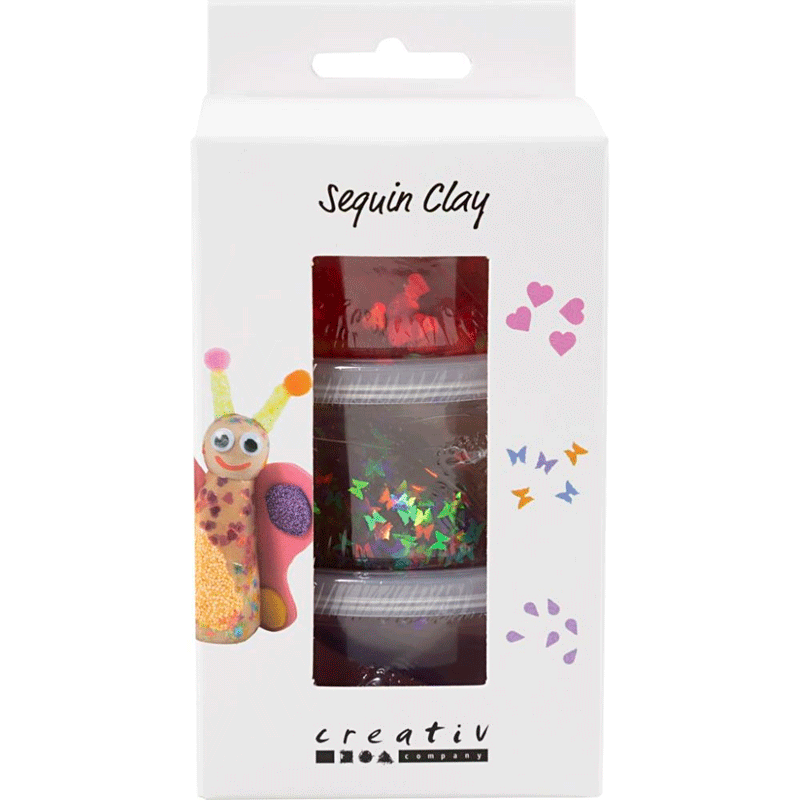 Giv dine kreative projekter ekstra wow-effekt med Sequin Clay. Den gennemsigtige masse er fyldt med store pailletter i forskellige former – såsom hjerter, emojis og sommerfugle. Når du fordeler massen i et tyndt lag, træder motiverne tydeligt frem og skaber flotte effekter. Massens konsistens gør den ideel til beklædning og dekoration, og den hæfter på materialer som Foam Clay®, Silk Clay®, pap, plast og træ. Massen tørrer hårdt op på ca. 2 timer. Skulle den blive tør, kan du nemt blødgøre den igen med lidt vand.